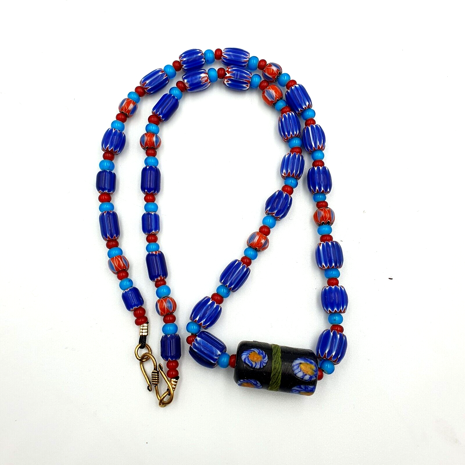 Antique white heart Venetian Style Blue Chevron Glass Beads necklace N9-1
