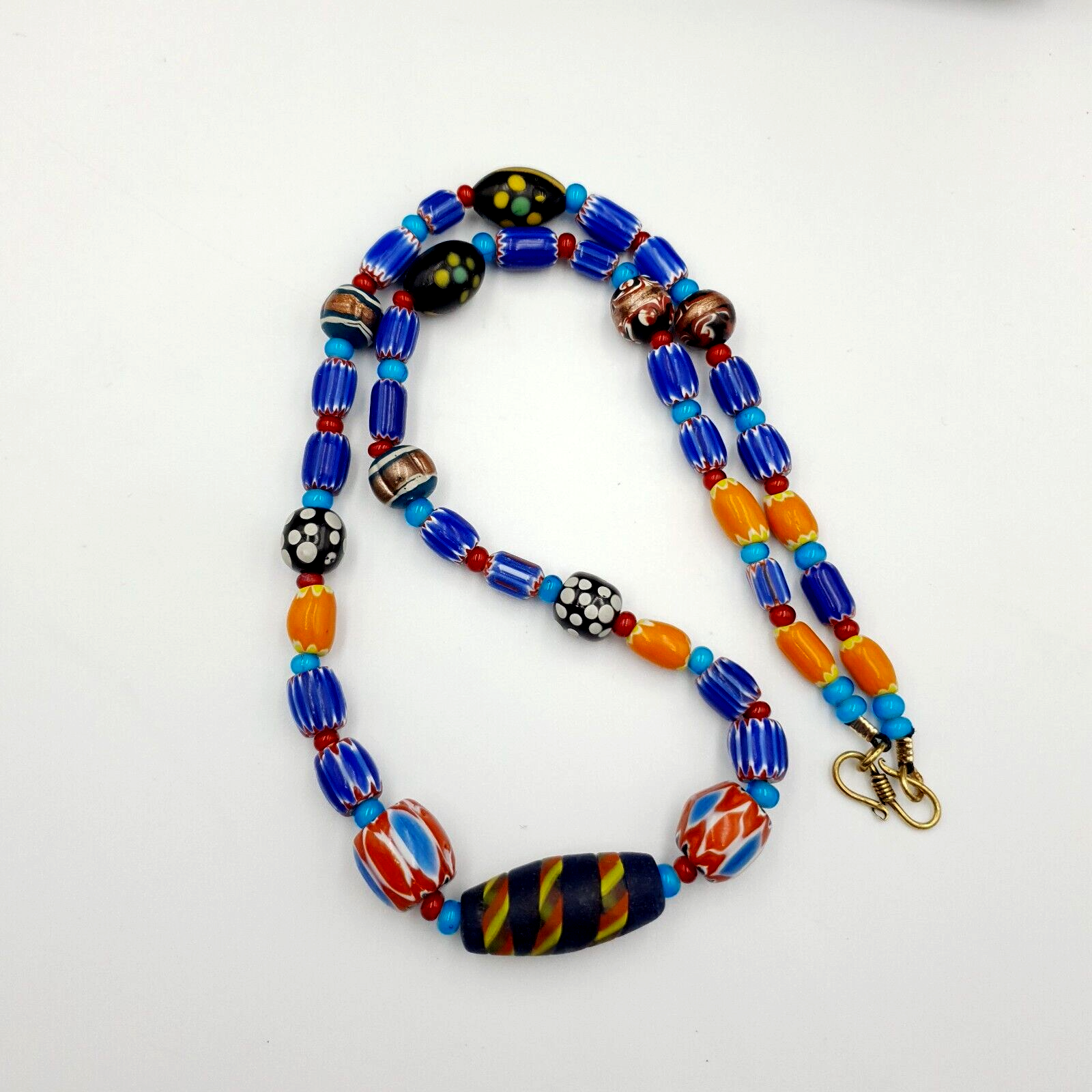 Antique white heart Venetian Style Blue Chevron Glass Beads necklace N9-7
