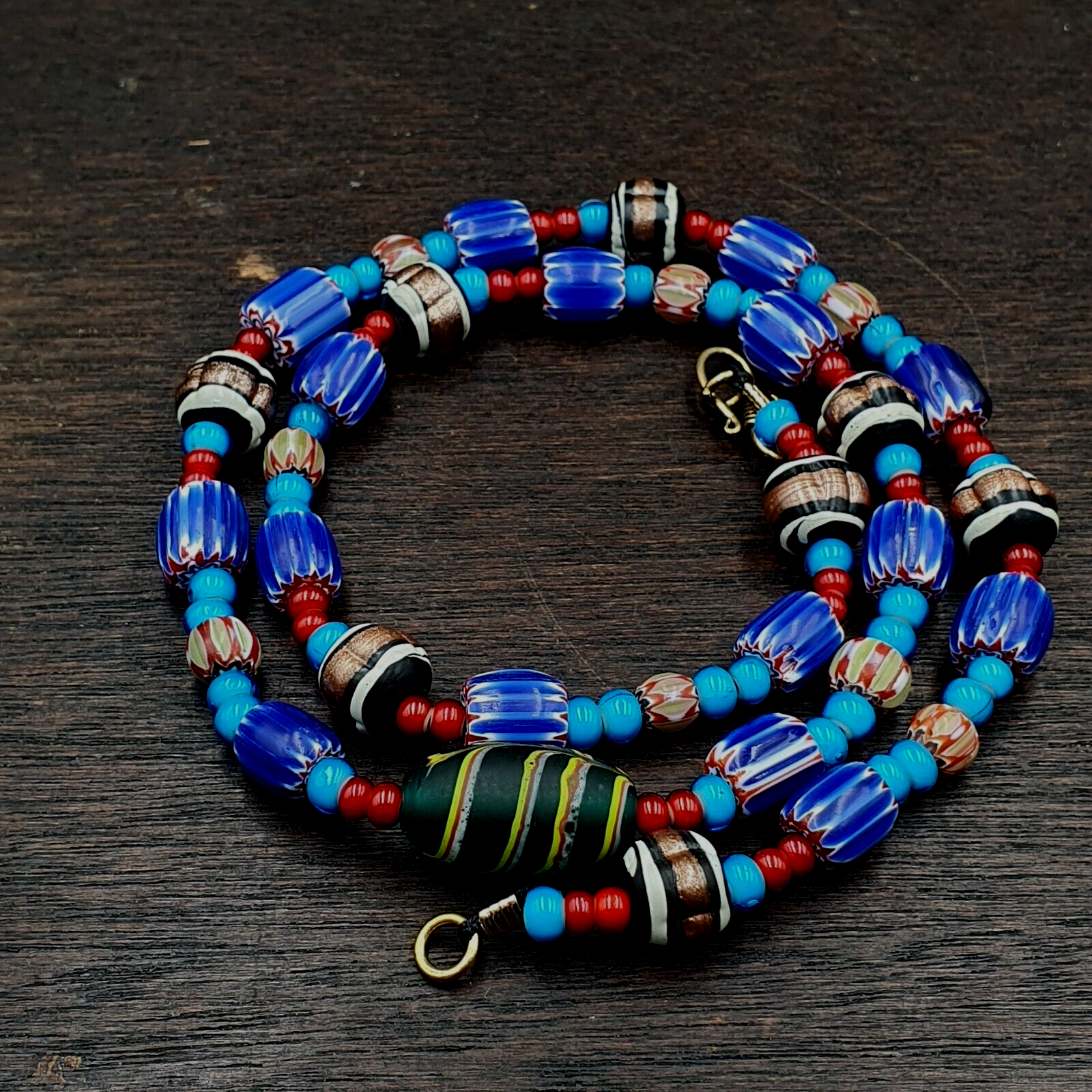 Antique white heart Venetian Style Blue Chevron Glass Beads necklace N9-9
