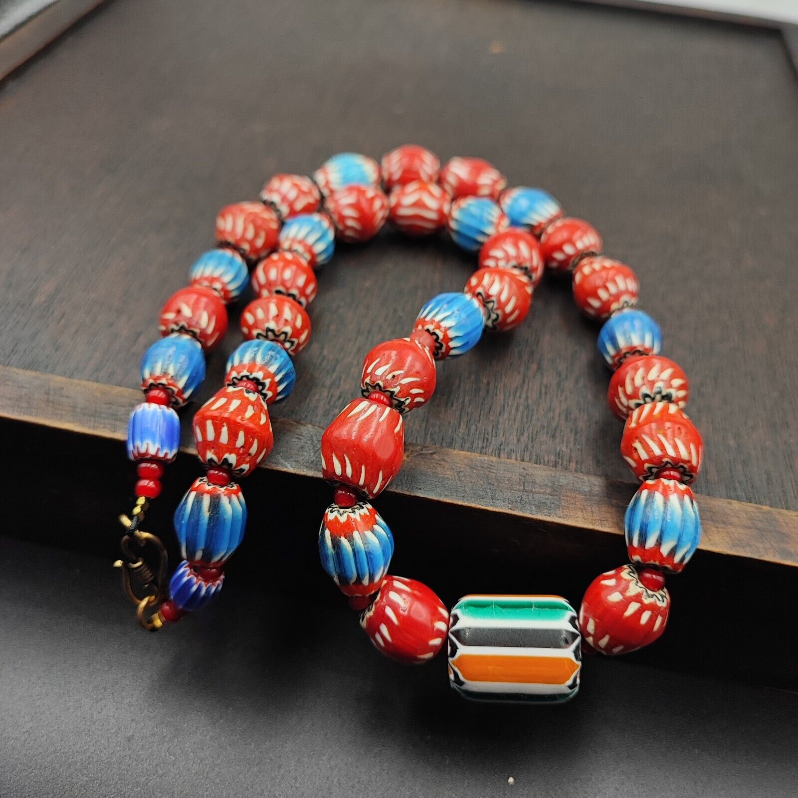 Stunning Vintage Venetian Trade Old African Multicolor Glass Chevron Beads Necklace
