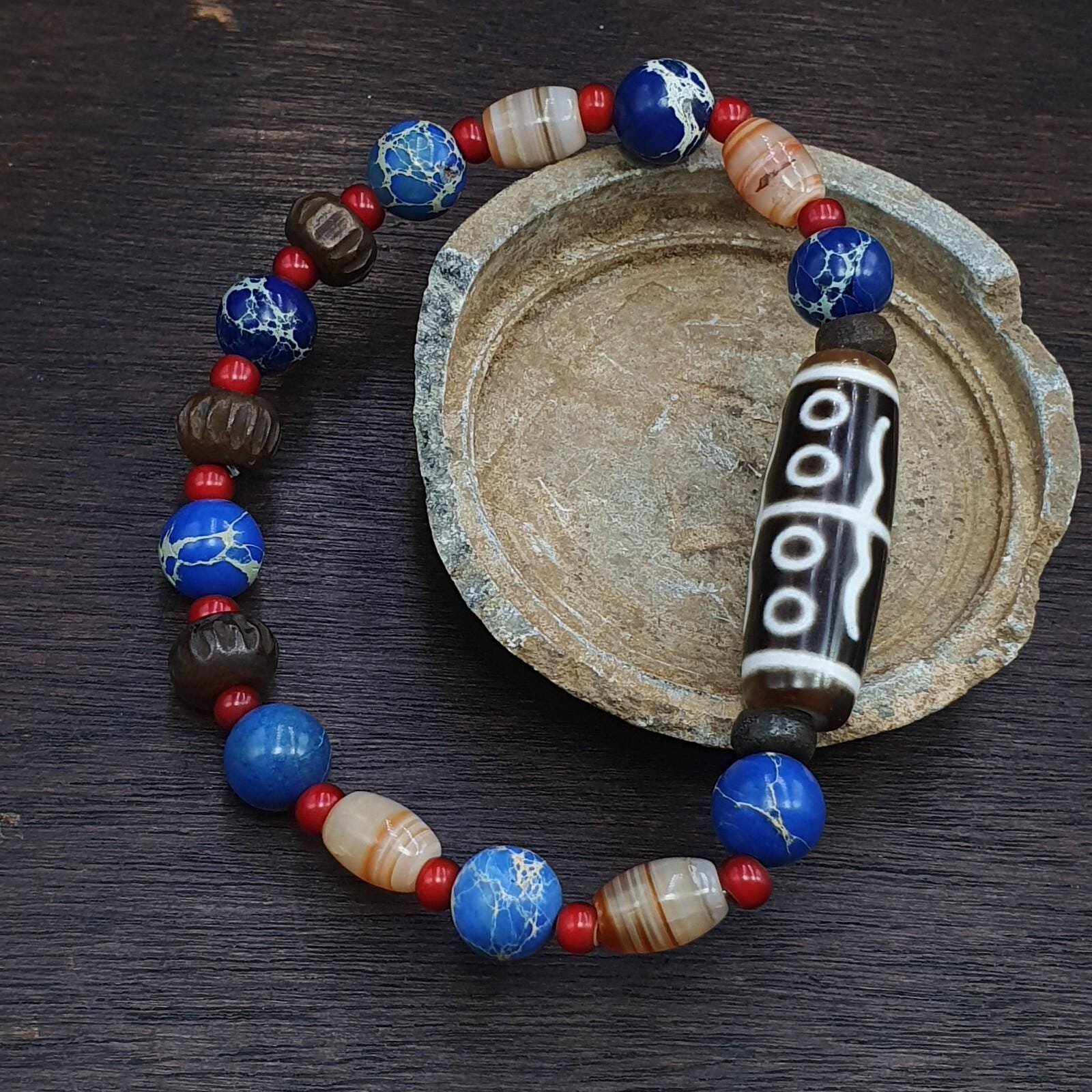 8 eyes old himalayan tibetan agate dzi and yak bone bead unique pattern bracelet