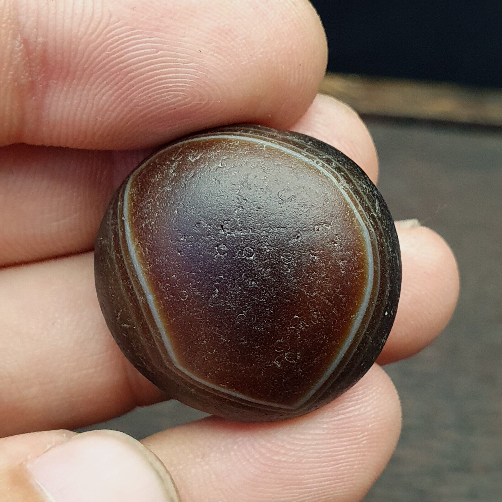 agate bead, dark brown color. This type of bead can be found in the Himalayan regions.Rare round...