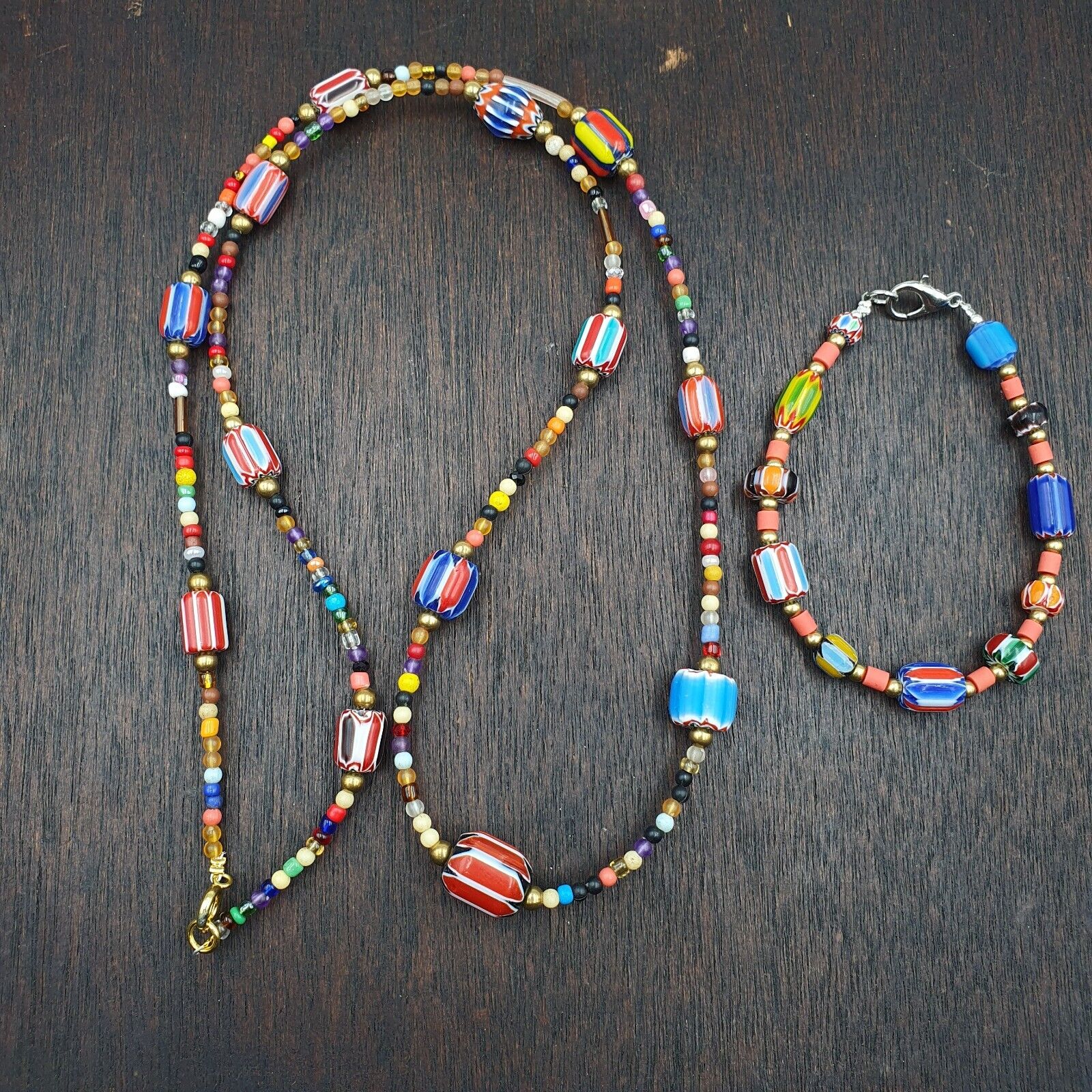 Stunning Vintage Venetian Trade Old African Multicolor Glass Chevron Beads NecklaceSET of 1 Necklace and bracelet. Stunning Old...