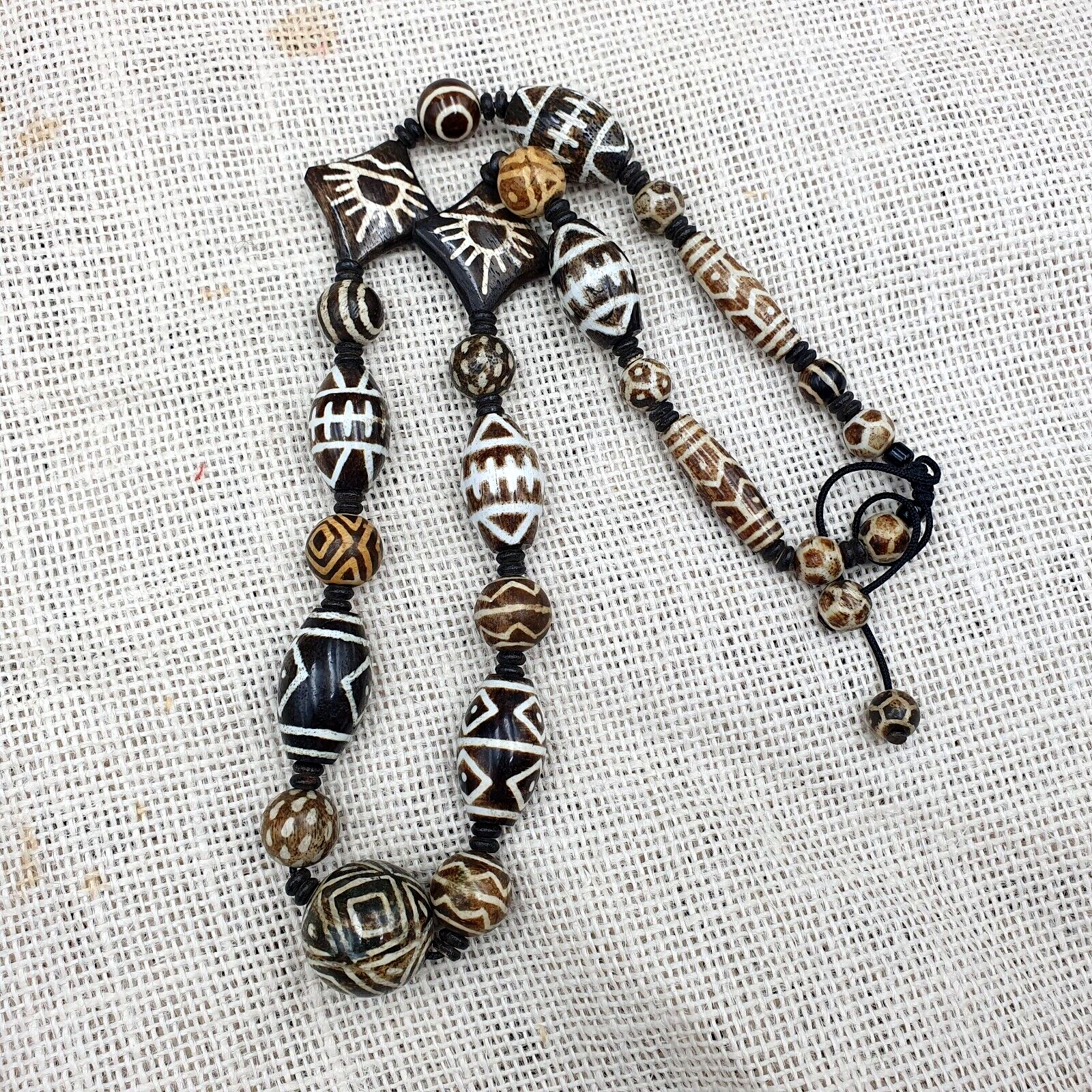 Asian Burmese Old Pumtek petrified Wood Stone beads Long necklace rare pattern  Pumtek Bead of Myanmar (Burma) ...