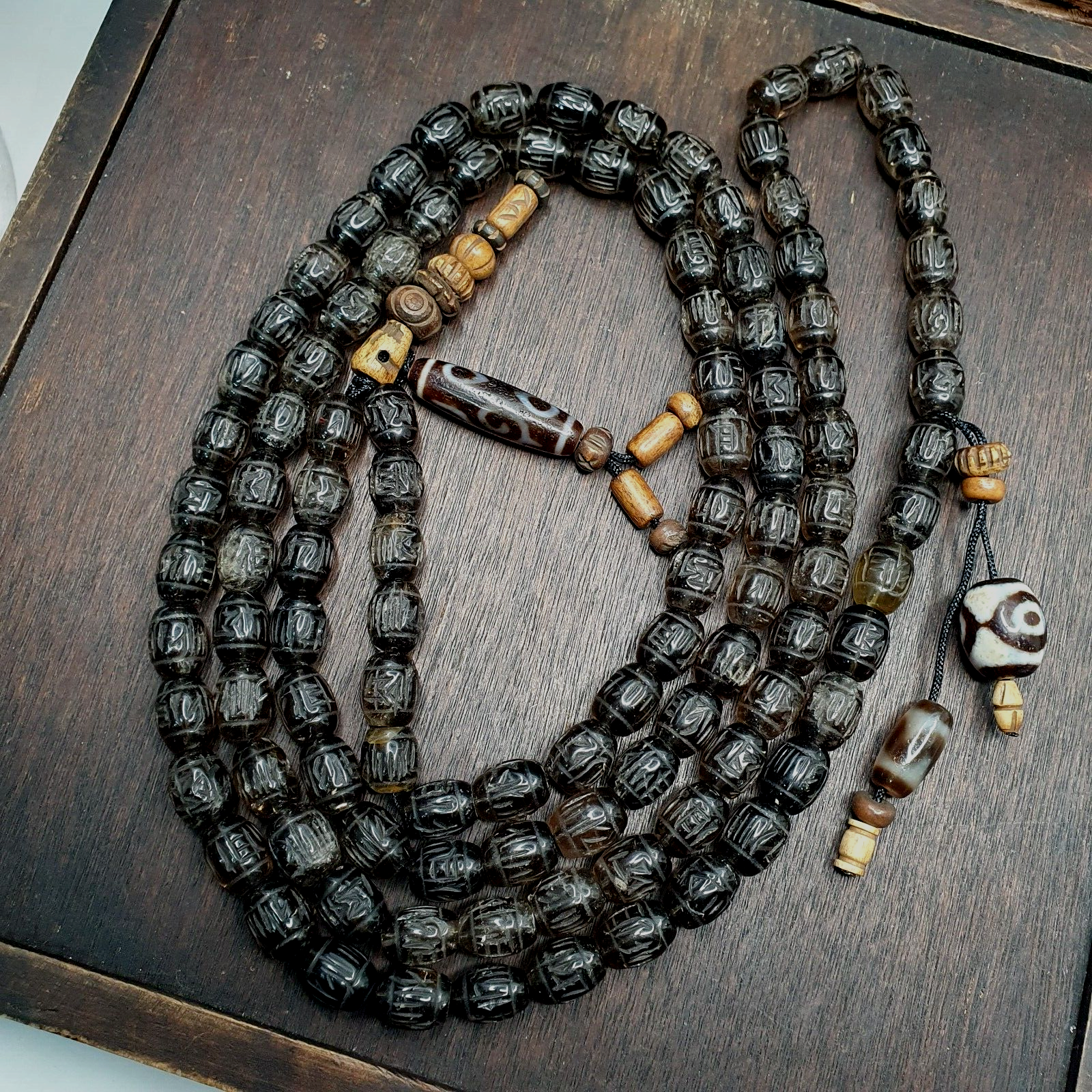 This is an old antique Tibetan mala rosary, made of genuine Natural Smokey Quartz And Agate Dzi Beads, one of the most valuable mala beads in Tibet,