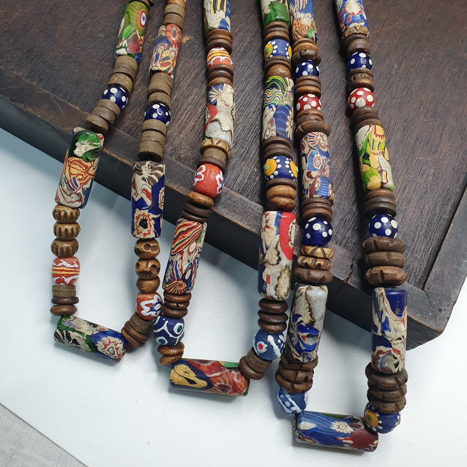 This beautiful necklace features unique Venetian Millefiori style beads paired with African Glass skunk eye beads. The colorful and playful design is perfect for adding a pop of personality to any outfit. Each bead is handmade with care, adding to the charm of this one-of-a-kind piece. The necklace falls under the categories of Collectibles and Beads, making it a great addition to any collection or crafting project. The tube style of the beads adds a modern touch to the traditional millefiori design. Whether you're looking for a statement piece or a fun accessory, this necklace is sure to catch the eye.