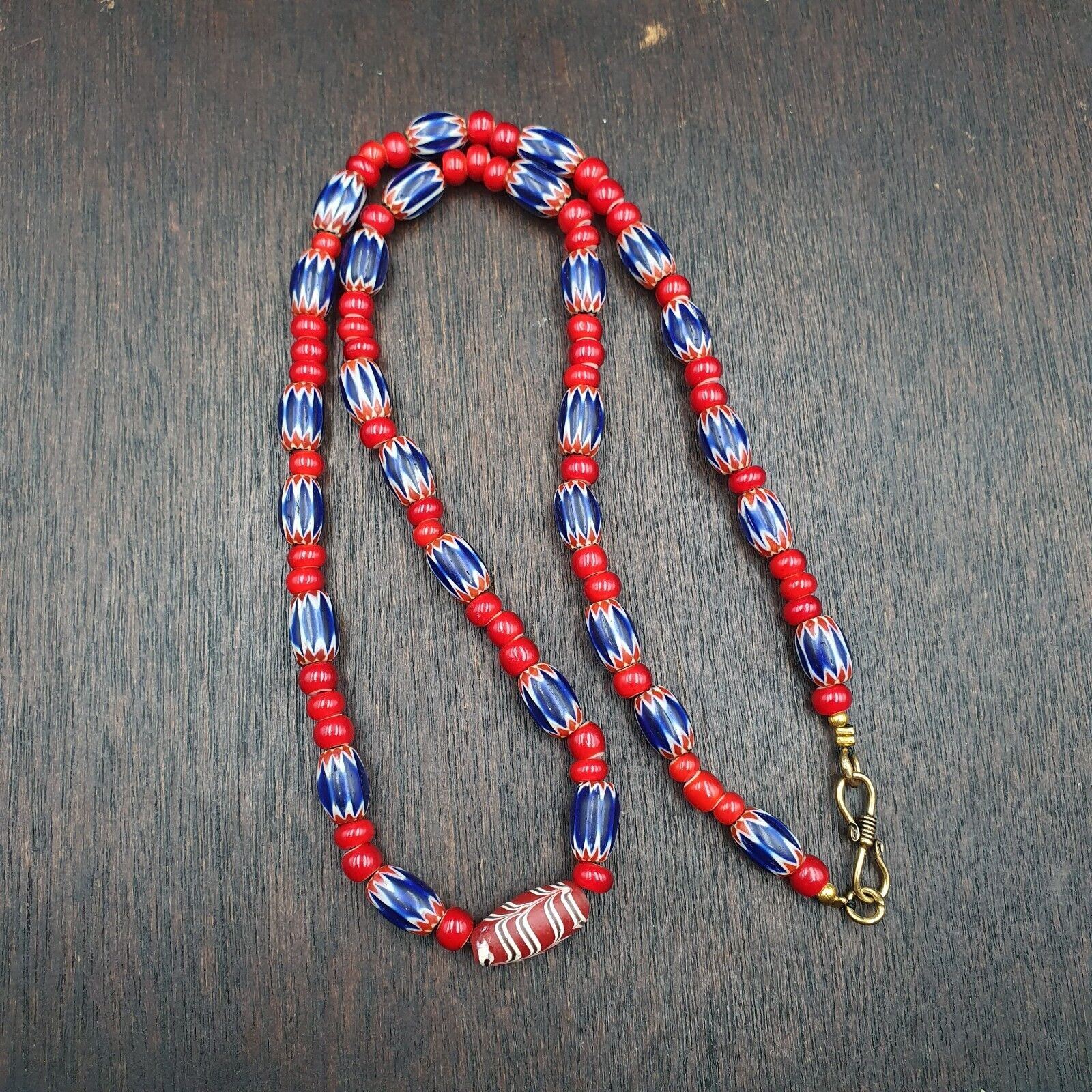 Combining these two types of beads in a necklace creates a unique and visually striking piece of jewelry. The contrast between the red and white of the WhiteHeart beads and the blue of the Chevron beads can create a beautiful and eye-catching design.