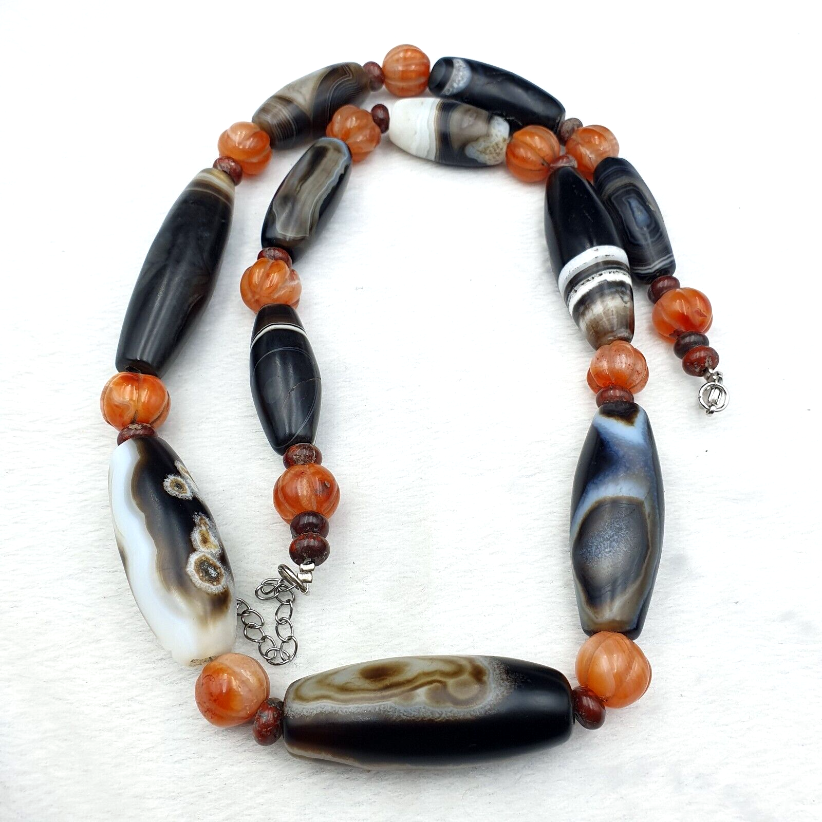 Himalayan old Antique Carnelian black Agate Beads Necklace Mala Indo-Tibetan