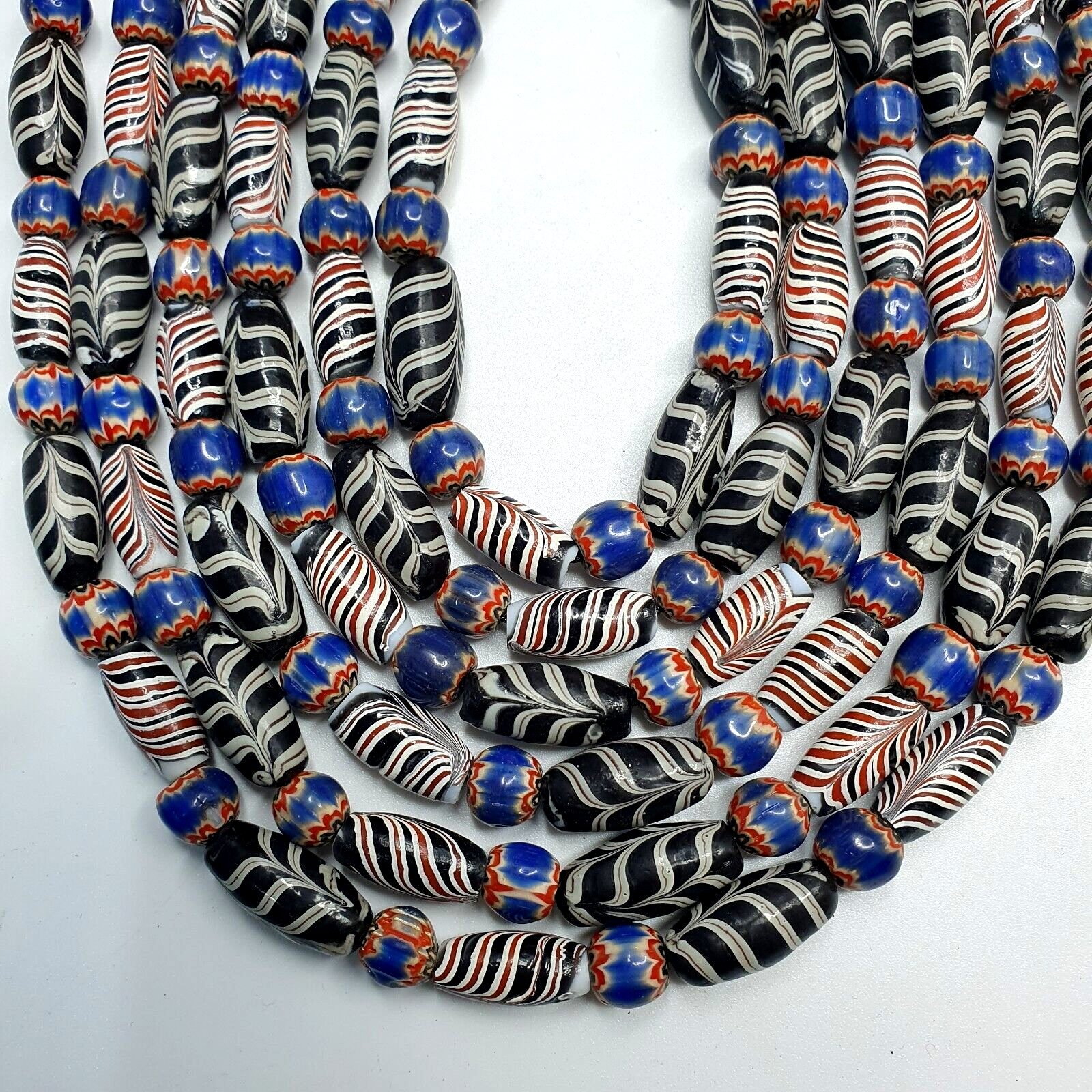 This stunning necklace features Venetian style multi-colored glass beads with a striking feather pattern and blue chevron...