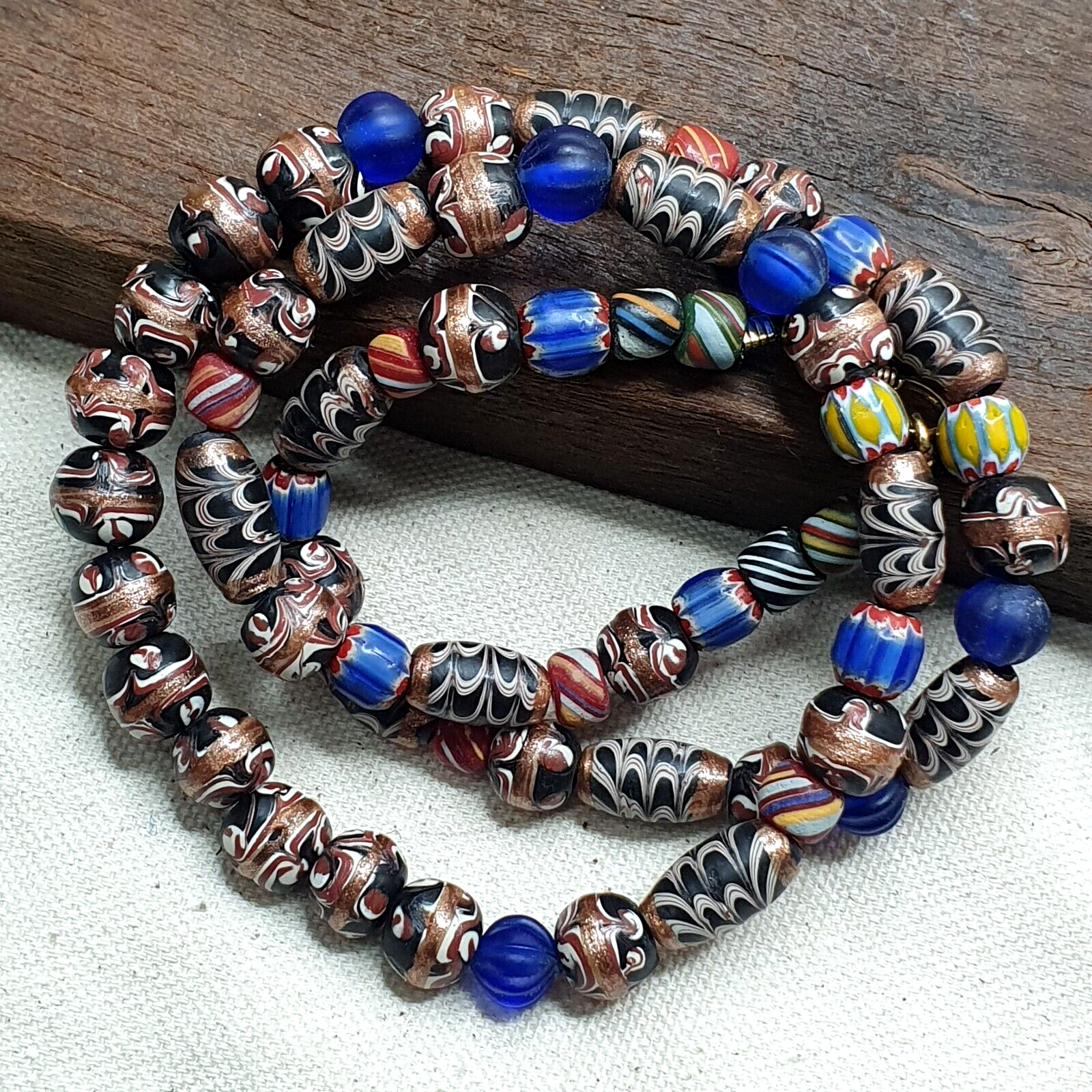 This beautiful necklace features a mix of Venetian style beads including Red whiteheart, Blue chevron, feather Pattern,...