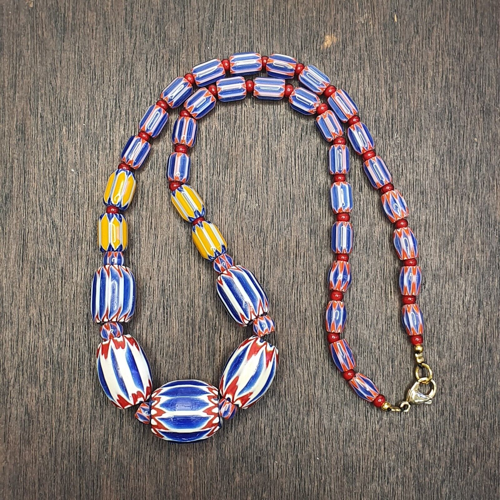 The necklace features a carefully designed arrangement that showcases the timeless elegance of glasswork. The chevron beads, with their rich colors and delicate lines, are complemented by smaller accent beads that add a touch of sparkle and refinement.