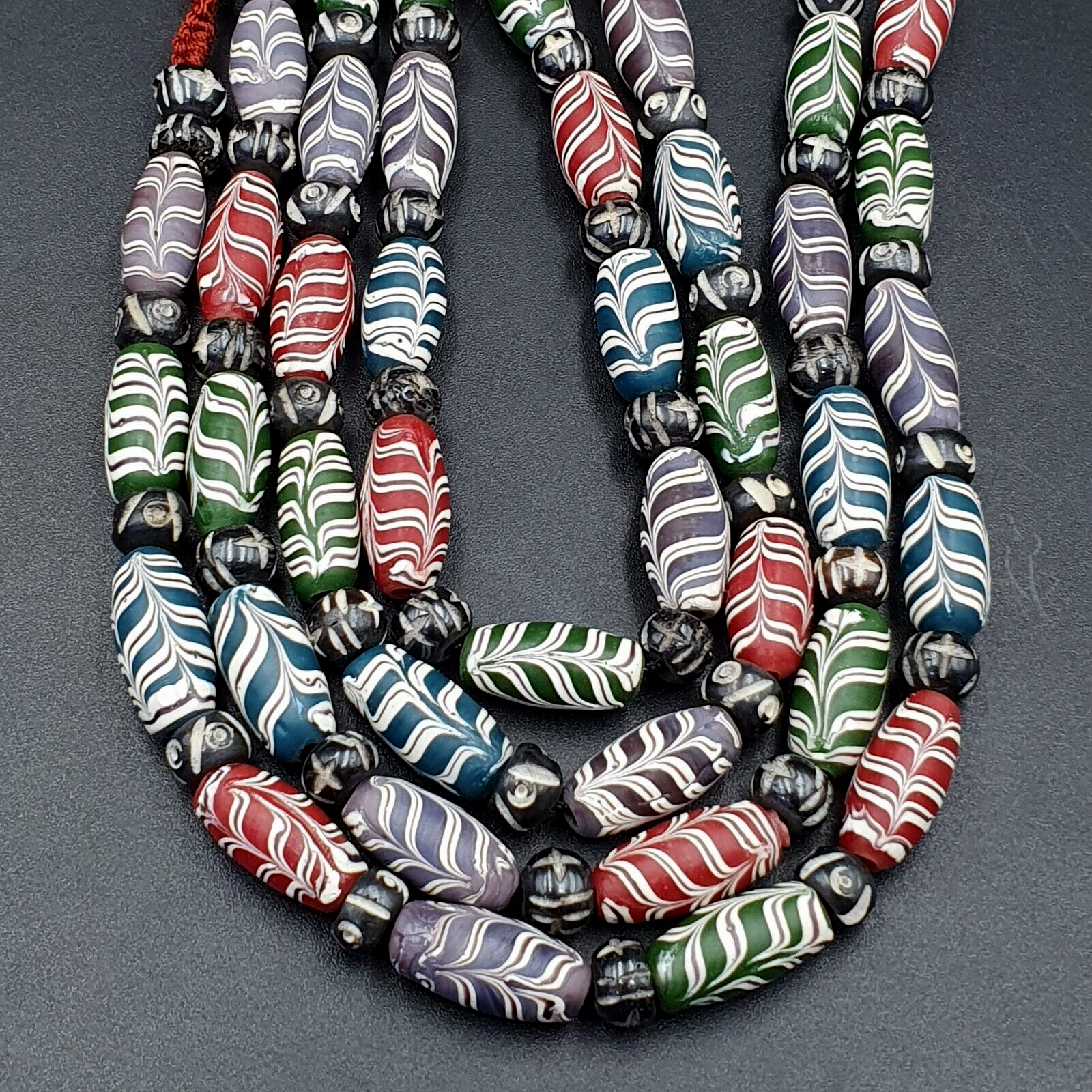 Beautiful vintage Millefiori Feather Pattern glass beads long necklace. Glass And Old Buffalo Bone Beads.Beads Size: 18-19mmx 9mm-10mmNecklace/Strand: 24...