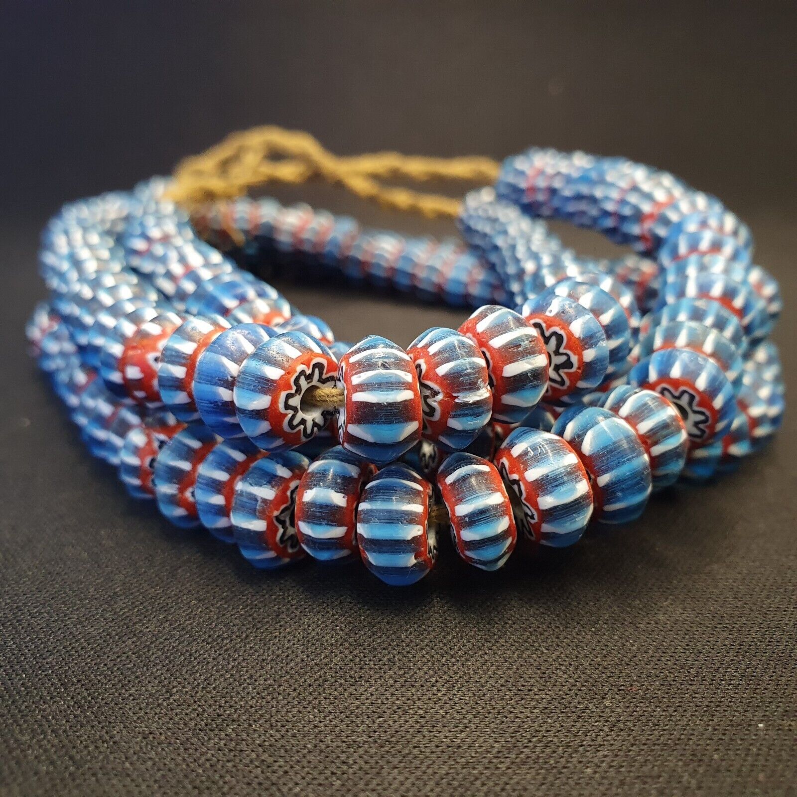 Chevron Beads SIX Layer Type of Object Drawn, multi-layered glass Color BLUE, RED, White Approximate Age Late 20th century Overall