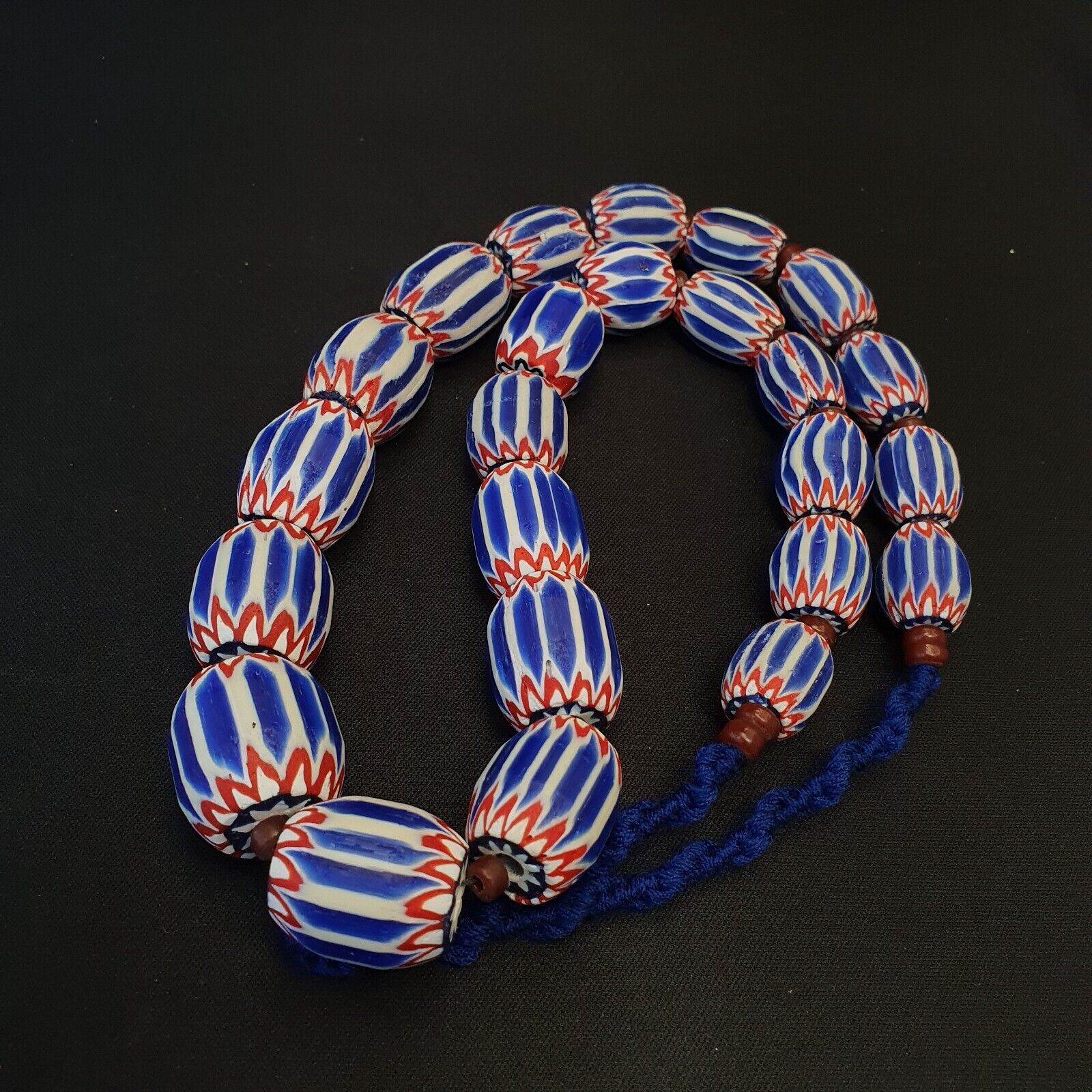 Other Names Chevron Beads SIX Layer Type of Object Drawn, multi-layered glass Color BLUE, RED, White Approximate Age Late 20th century Overall