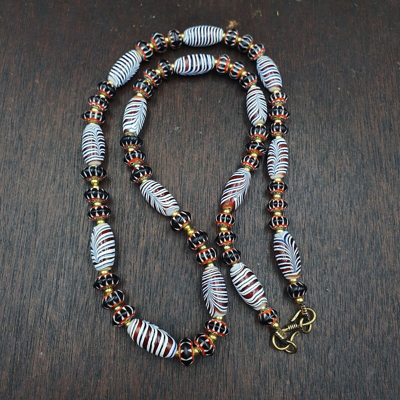 Beautiful vintage Millefiori Venetian Style Feather Pattern glass beads long necklace.