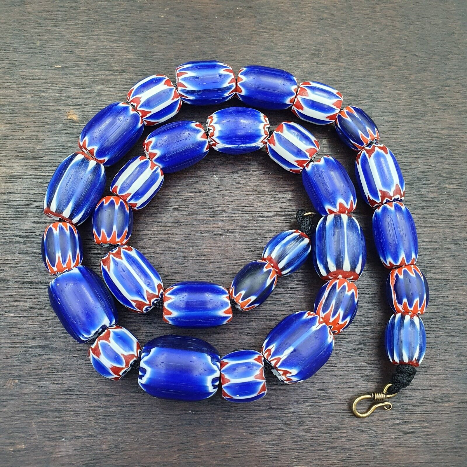 Other Names Chevron Beads SIX Layer Type of Object Drawn, multi-layered glass Color BLUE, RED, White Approximate Age Late 20th century Overall