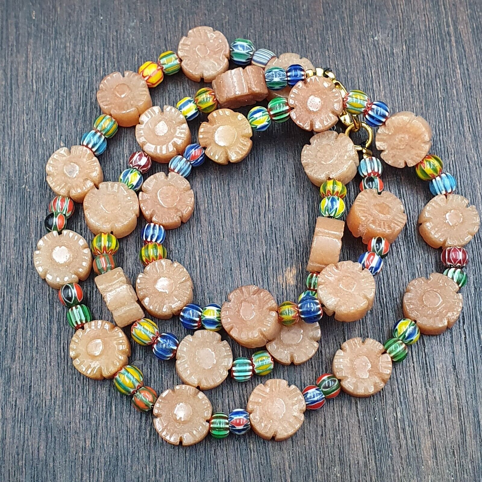 Vintage Yellow Carving Aventurine stone and venetian Chevron Beads Mala Necklace