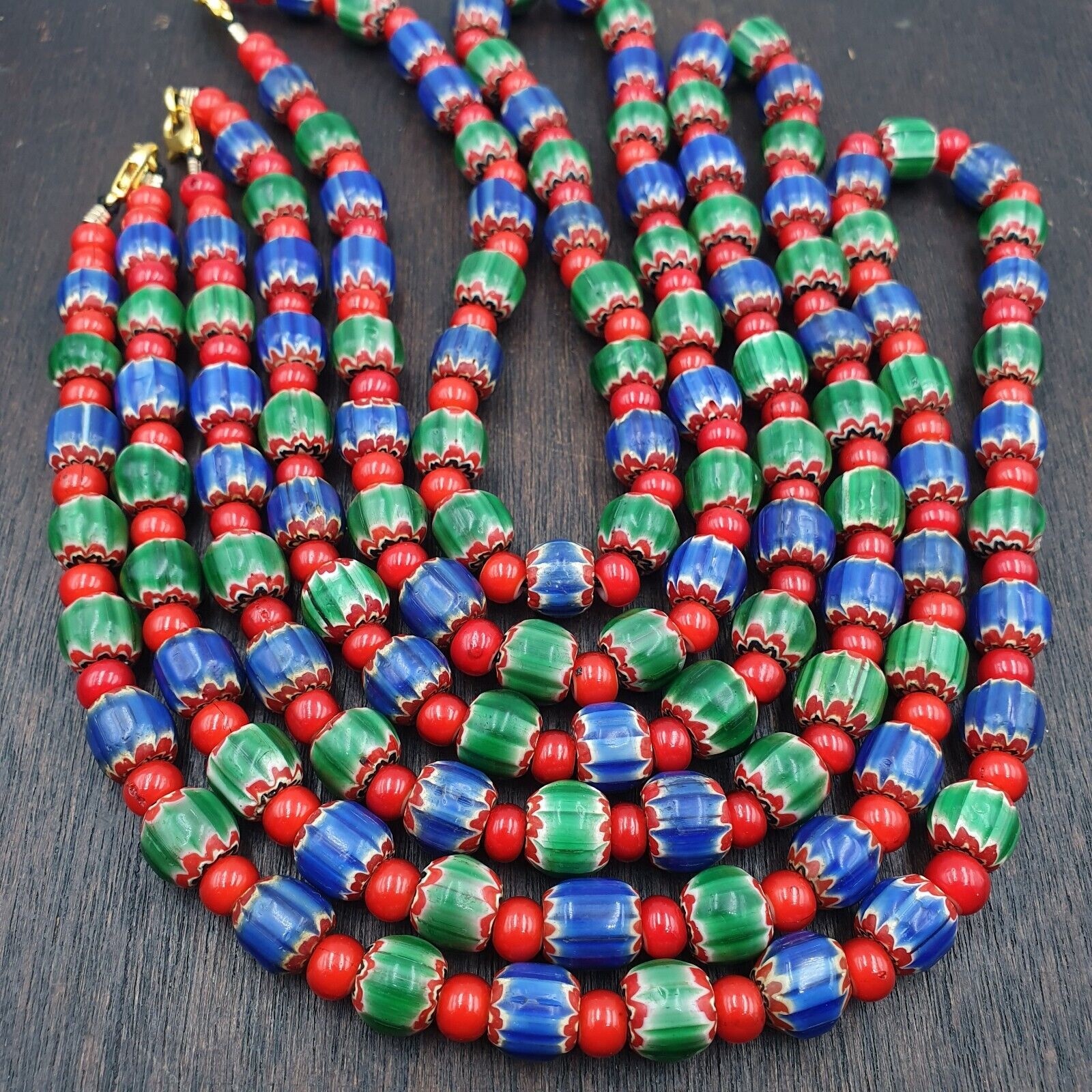 Heritage Jewels: Handcrafted Vintage Venetian 6.5mm Red WhiteHeart Beads and Venetian Style Green Blue Chevron Beads Necklace