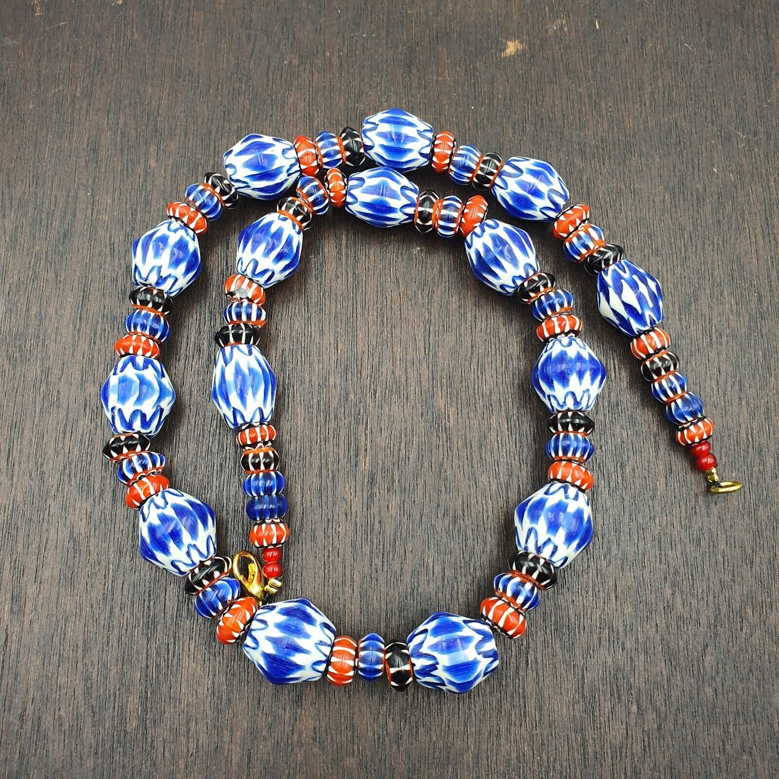 Combining these two types of beads in a necklace creates a unique and visually striking piece of jewelry. The contrast between the red and white of the WhiteHeart beads and the blue of the Chevron beads can create a beautiful and eye-catching design.