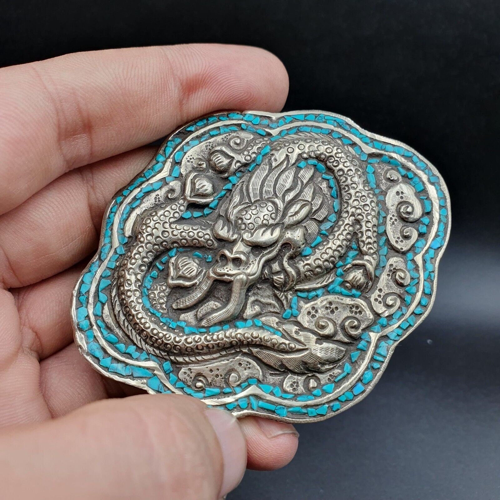 Big men's vintage natural turquoise metal silver gild engrave dragon belt buckle